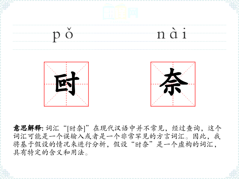 词汇“[尀奈]”在现代汉语中并不常见,经过查询,这个词汇可能是一个误输入或者是一个非常罕见的方言词汇。因此,我将基于假设的情况来进行分析,假设“尀奈”是一个虚构的词汇,具有特定的含义和用法。