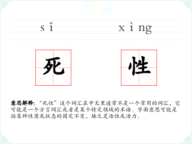“死性”这个词汇虽然不常见,但它反映了语言中对于固定不变性质的描述。在语言学习和表达中,了解这样的词汇可以帮助我们更准确地理解和描述世界。