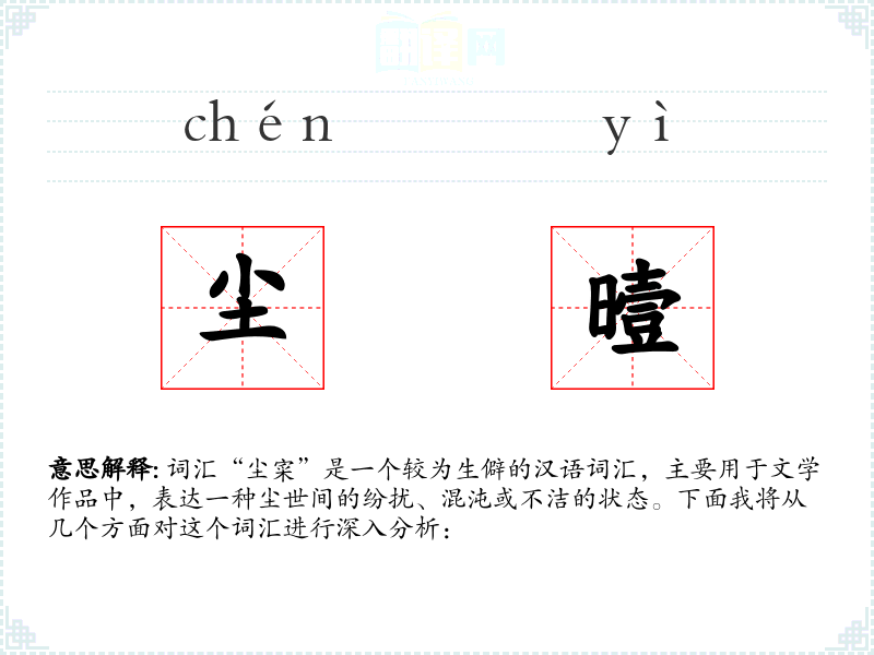 词汇“尘寀”是一个较为生僻的汉语词汇,主要用于文学作品中,表达一种尘世间的纷扰、混沌或不洁的状态。下面我将从几个方面对这个词汇进行深入分析: