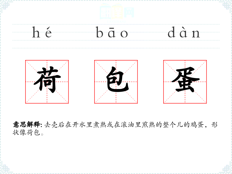 去壳后在开水里煮熟或在滚油里煎熟的整个儿的鸡蛋,形状像荷包。