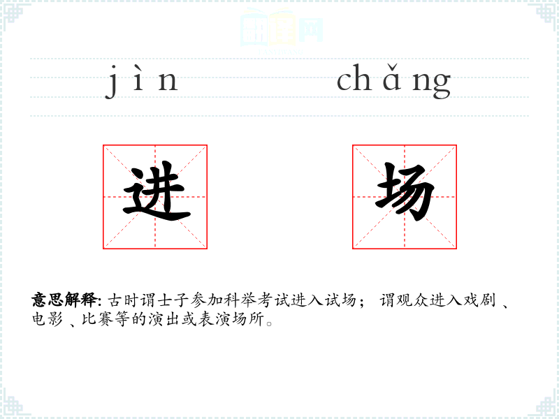 古时谓士子参加科举考试进入试场; 谓观众进入戏剧﹑电影﹑比赛等的演出或表演场所。