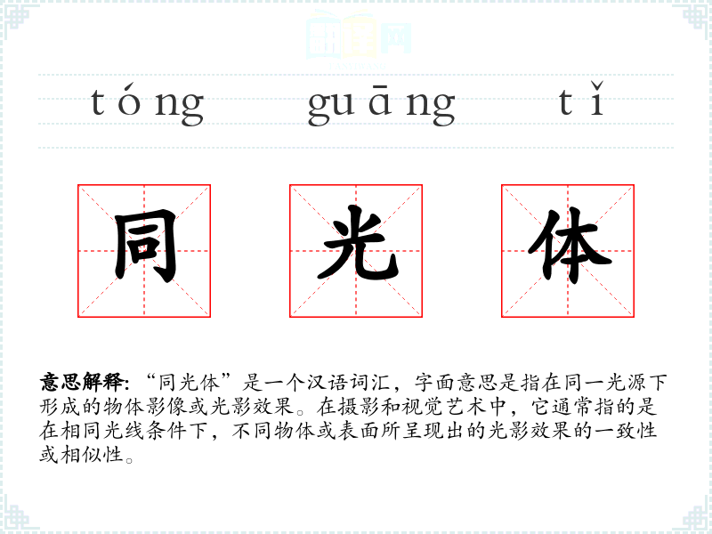 “同光体”这个词汇可能是由“同”(相同)和“光体”(光影效果)两个词组合而成。在现代汉语中,它主要用于描述视觉艺术中的光影效果,但在古代文献中可能没有直接对应的概念。