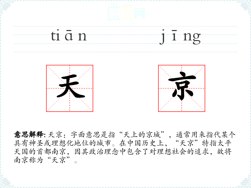 天京:字面意思是指“天上的京城”,通常用来指代某个具有神圣或理想化地位的城市。在**历史上,“天京”特指太平天国的首都南京,因其政治理念中包含了对理想社会的追求,故将南京称为“天京”。