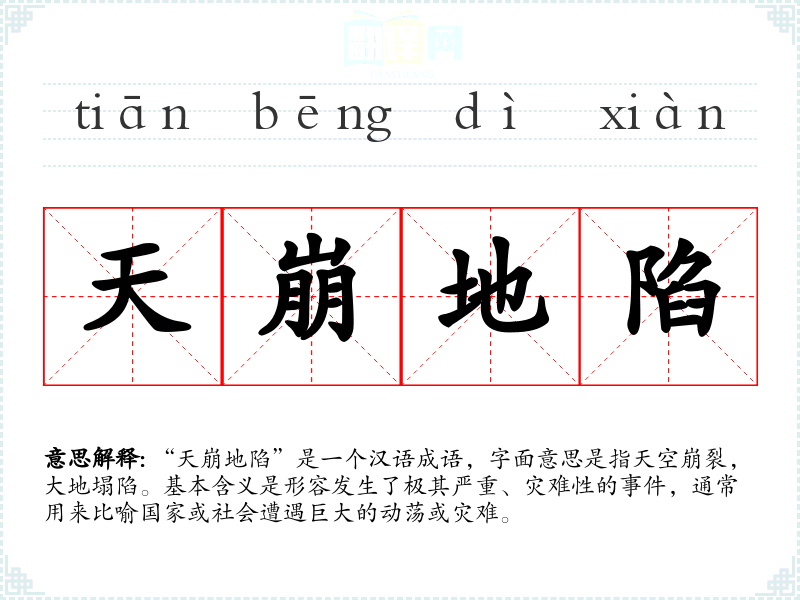 “天崩地陷”这个成语的词源较为古老,可能源自古代人们对自然灾害的恐惧和敬畏。随着时间的推移,这个成语的含义逐渐固定下来,成为描述极端灾难的常用表达。