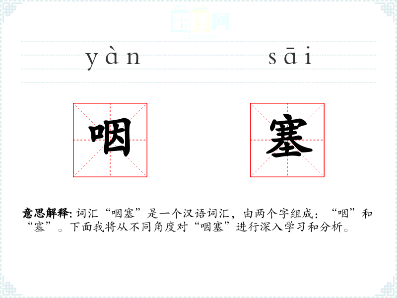 “咽”字古汉语中指咽喉,是一个表示生理部位的名词。“塞”字则有堵塞、阻塞的意思。两者结合,形成了描述咽喉堵塞的词汇“咽塞”。