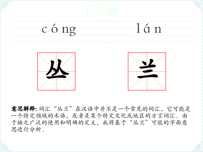 词汇“丛兰”在汉语中并不是一个常见的词汇,它可能是一个特定领域的术语,或者是某个特定文化或地区的方言词汇。由于缺乏广泛的使用和明确的定义,我将基于“丛兰”可能的字面意思进行分析。
