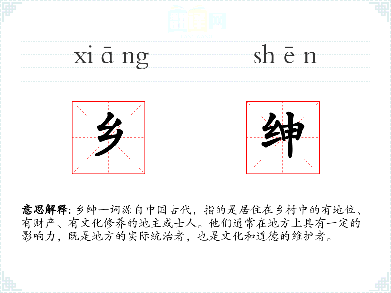 乡绅这个词在*历史和文化中占有重要地位,它不仅代表了一个社会阶层,也反映了传统社会的结构和价值观。在学语言和理解文化时,了解乡绅的含义和影响是很有帮助的。