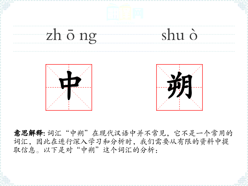 词汇“中朔”在现代汉语中并不常见,它不是一个常用的词汇,因此在进行深入学*和分析时,我们需要从有限的资料中提取信息。以下是对“中朔”这个词汇的分析: