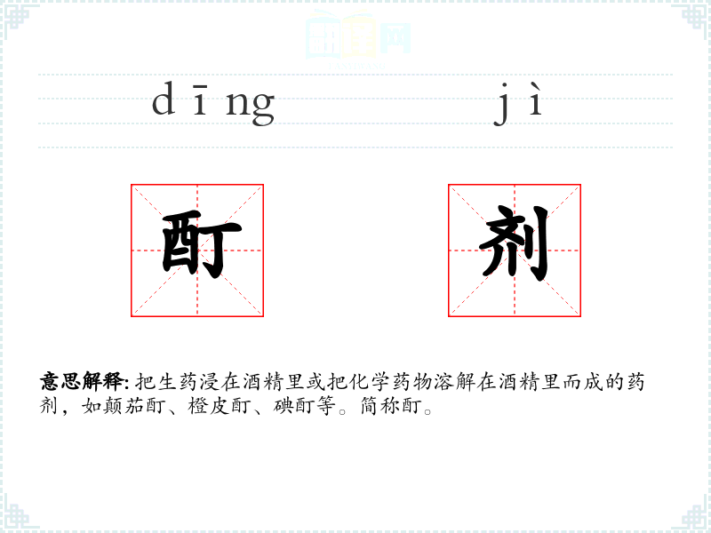 把生药浸在酒精里或把化学药物溶解在酒精里而成的药剂,如颠茄酊、橙皮酊、碘酊等。简称酊。