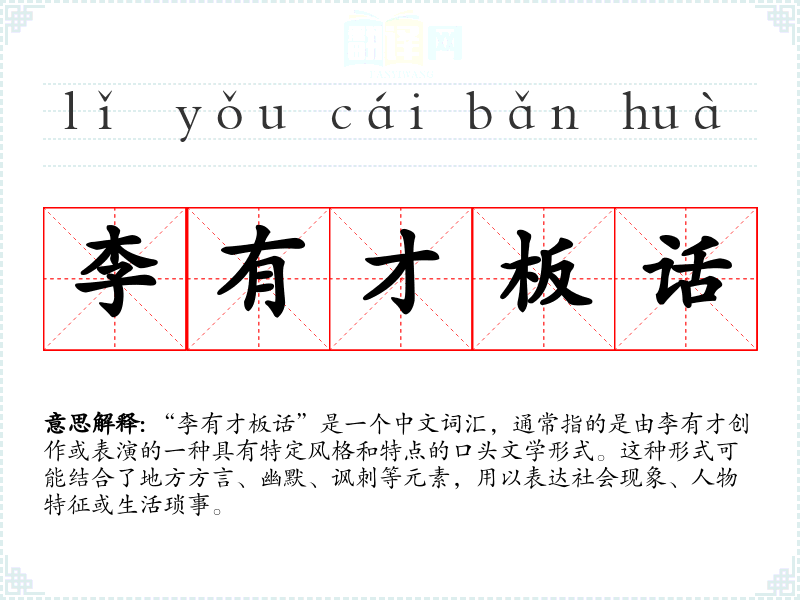 “李有才板话”是一个中文词汇,通常指的是由李有才创作或表演的一种具有特定风格和特点的口头文学形式。这种形式可能结合了地方方言、幽默、讽刺等元素,用以表达社会现象、人物特征或生活琐事。