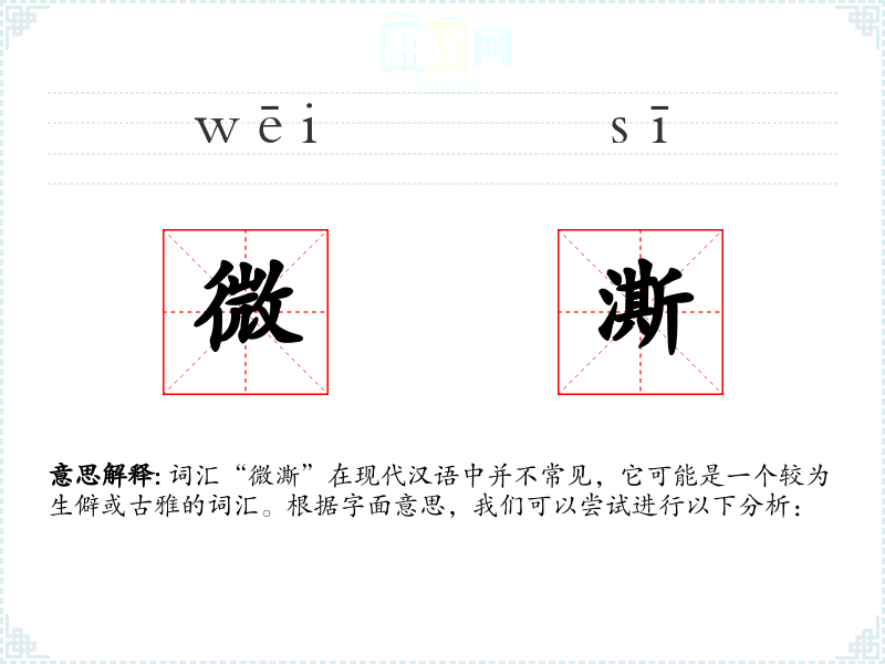 词汇“微澌”在现代汉语中并不常见,它可能是一个较为生僻或古雅的词汇。根据字面意思,我们可以尝试进行以下分析: