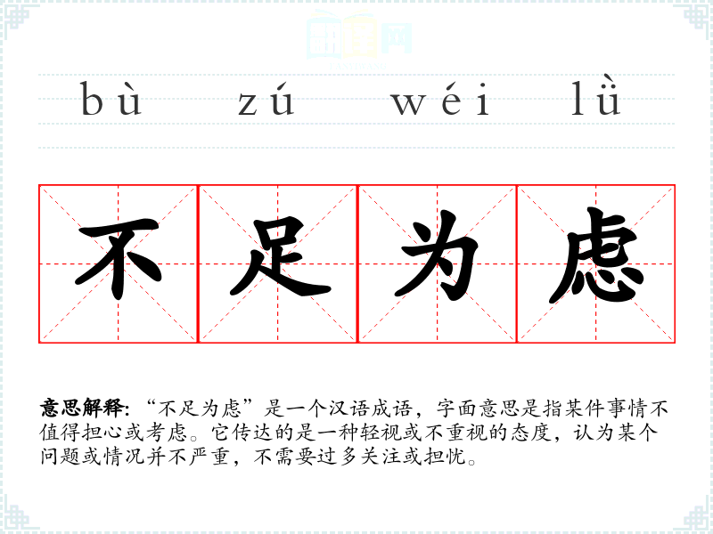 “不足为虑”这个词汇在汉语中是一个非常有用的表达,它不仅能够帮助人们在面对问题时保持冷静和理性,还能够作为一种安慰和鼓励的方式。在学*语言和表达时,理解和正确使用这样的词汇是非常重要的。