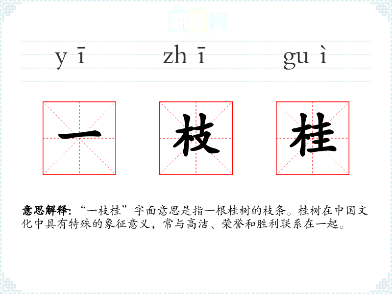 “桂”字最早见于《说文解字》,原指一种植物,后因其香气和药用价值,逐渐被赋予更多的文化象征意义。在古代,科举考试中状元被称为“折桂”,因此“一枝桂”也常与荣誉和成功联系在一起。