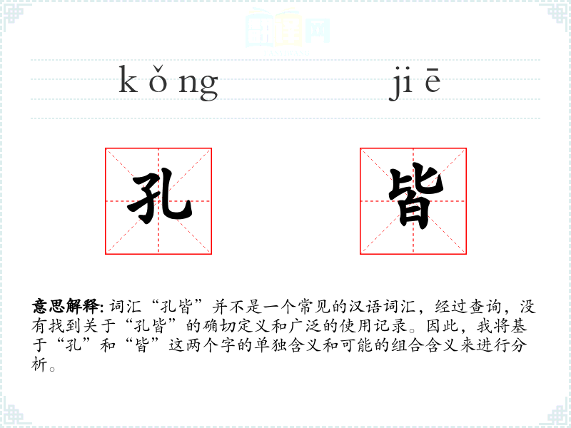 词汇“孔皆”并不是一个常见的汉语词汇,经过查询,没有找到关于“孔皆”的确切定义和广泛的使用记录。因此,我将基于“孔”和“皆”这两个字的单独含义和可能的组合含义来进行分析。