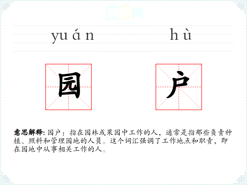 园户:指在园林或果园中工作的人,通常是指那些负责种植、照料和管理园地的人员。这个词汇强调了工作地点和职责,即在园地中从事相关工作的人。