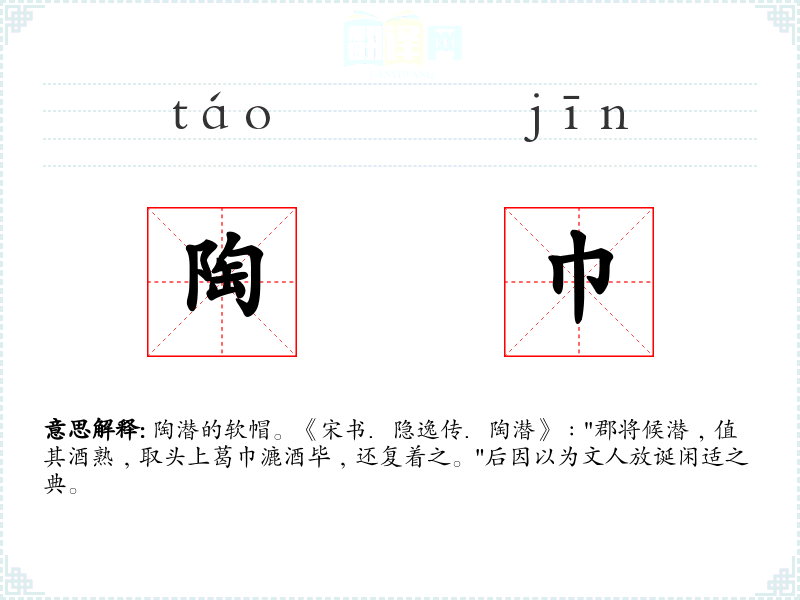 陶潜的软帽。《宋书.隐逸传.陶潜》﹕"郡将候潜﹐值其酒熟﹐取头上葛巾漉酒毕﹐还复着之。"后因以为文人放诞闲适之典。