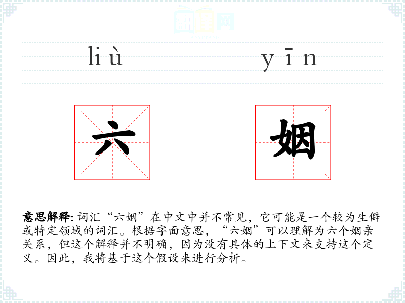 词汇“六姻”在中文中并不常见,它可能是一个较为生僻或特定领域的词汇。根据字面意思,“六姻”可以理解为六个姻亲关系,但这个解释并不明确,因为没有具体的上下文来支持这个定义。因此,我将基于这个假设来进行分析。