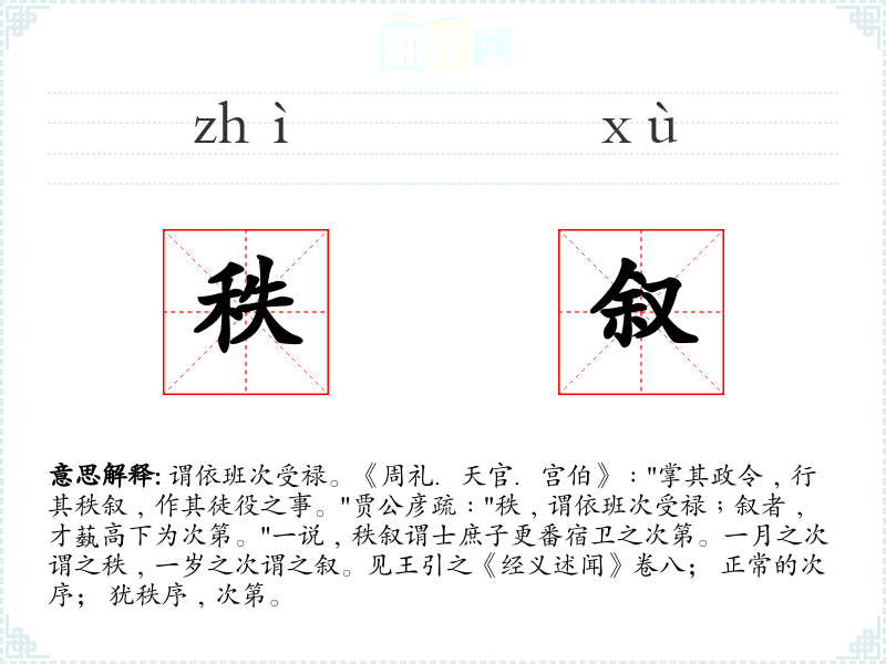 1.谓依班次受禄。《周礼.天官.宫伯》﹕"掌其政令﹐行其秩叙﹐作其徒役之事。"贾公彦疏﹕"秩﹐谓依班次受禄﹔叙者﹐才蓺高下为次第。"一说﹐秩叙谓士庶子更番宿卫之次第。一月之次谓之秩﹐一岁之次谓之叙。见王引之《经义述闻》卷八; 正常的次序; 犹秩序﹐次第。