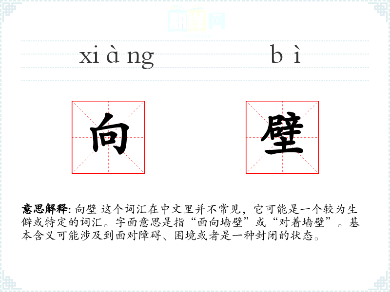 由于向壁不是一个常用词汇,它在不同的语境中可能会有不同的含义。在文学作品中,它可能用来形容一个人孤独、沉思或者面对困境的状态。在口语中,这个词汇可能不太常用,除非在特定的语境下,比如讨论心理状态或者物理位置时。