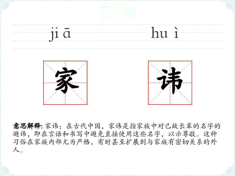 - 老师提醒学生,在写作文时要注意家讳,不要直接使用家族中已故长辈的名字。