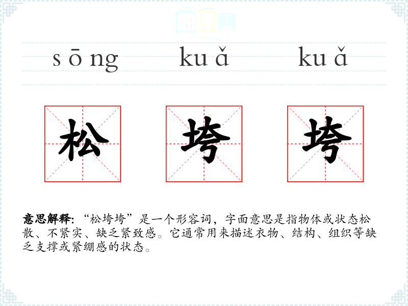 “松垮垮”是一个形容词,字面意思是指物体或状态松散、不紧实、缺乏紧致感。它通常用来描述衣物、结构、组织等缺乏支撑或紧绷感的状态。