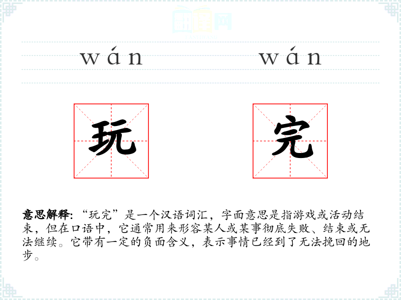 “玩完”是一个汉语词汇,字面意思是指游戏或活动结束,但在口语中,它通常用来形容某人或某事彻底失败、结束或无法继续。它带有一定的负面含义,表示事情已经到了无法挽回的地步。