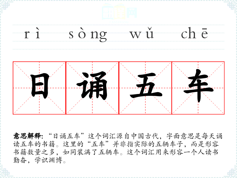 “日诵五车”这个词汇源自**古代,字面意思是每天诵读五车的书籍。这里的“五车”并非指实际的五辆车子,而是形容书籍数量之多,如同装满了五辆车。这个词汇用来形容一个人读书勤奋,学识渊博。