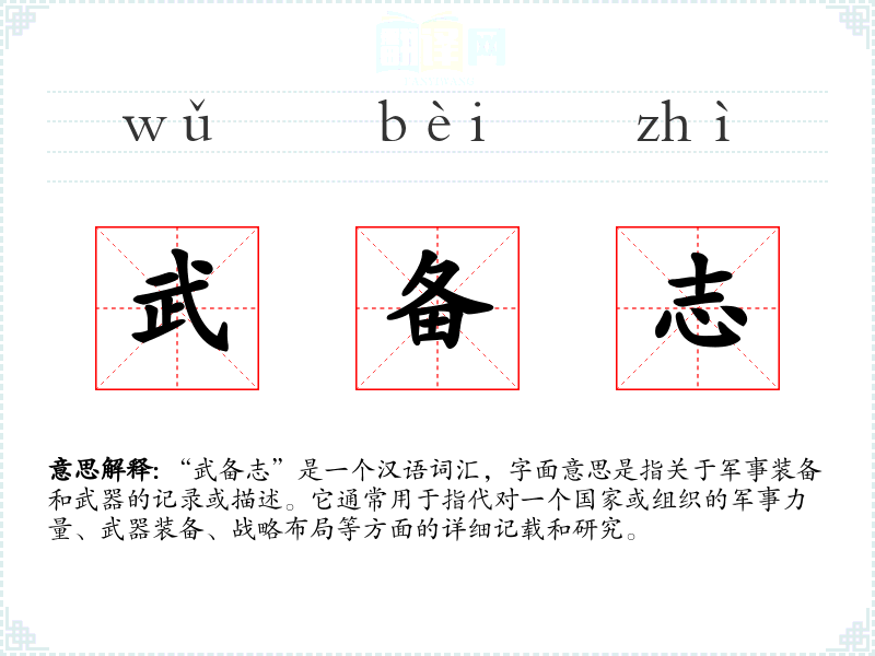 “武备志”是一个汉语词汇,字面意思是指关于军事装备和武器的记录或描述。它通常用于指代对一个国家或组织的军事力量、武器装备、战略布局等方面的详细记载和研究。