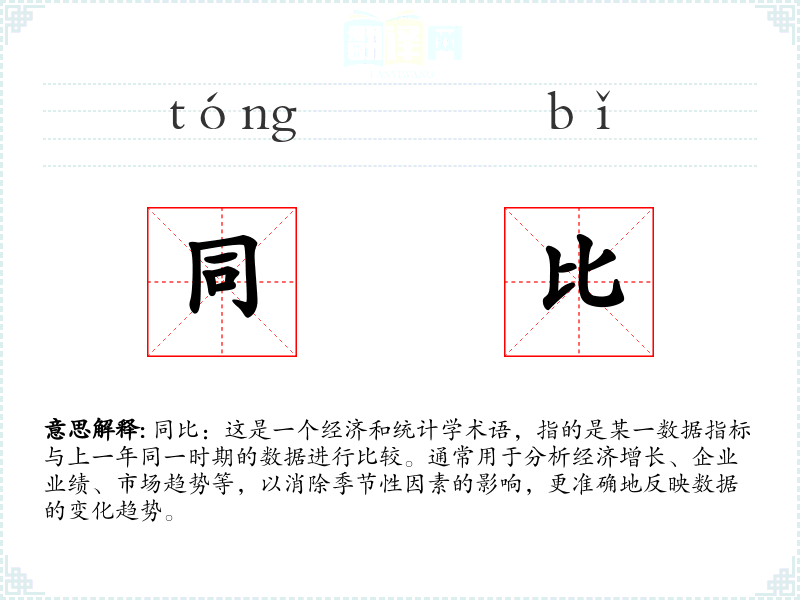 同义词:环比(与上一周期相比,通常是月份或季度) 反义词:无直接反义词,但可以用“下降”、“减少”等词来描述同比负增长的情况。