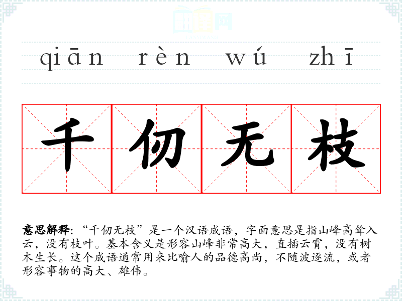 “千仞无枝”是一个汉语成语,字面意思是指山峰高耸入云,没有枝叶。基本含义是形容山峰非常高大,直插云霄,没有树木生长。这个成语通常用来比喻人的品德高尚,不随波逐流,或者形容事物的高大、雄伟。