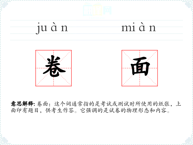 - 反义词:答案、解析(这些词与“卷面”相关,但不是直接的反义词)