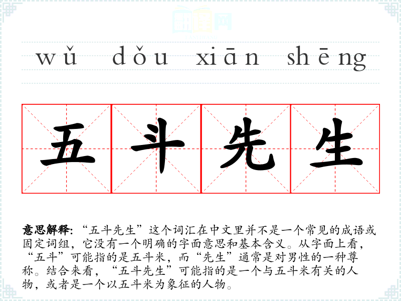 “五斗先生”这个词汇在中文里并不是一个常见的成语或固定词组,它没有一个明确的字面意思和基本含义。从字面上看,“五斗”可能指的是五斗米,而“先生”通常是对男性的一种尊称。结合来看,“五斗先生”可能指的是一个与五斗米有关的人物,或者是一个以五斗米为象征的人物。