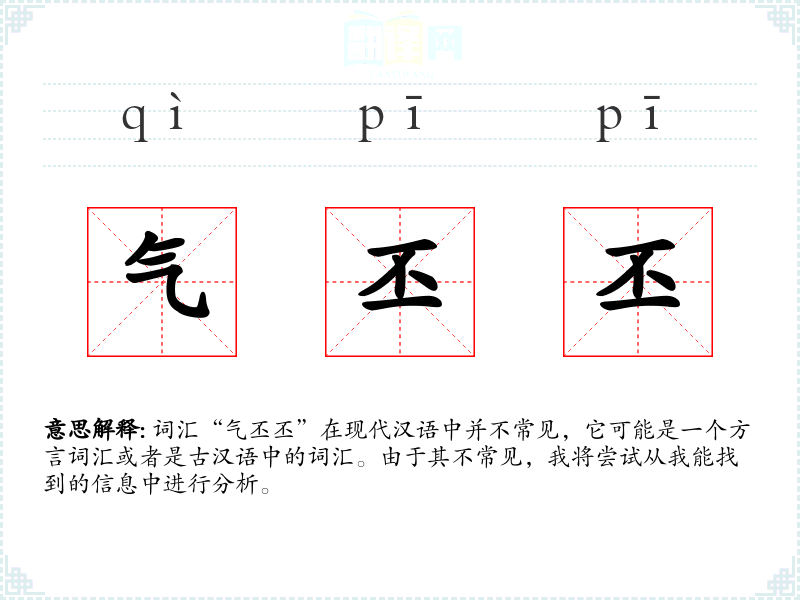 “气丕丕”可能是一个形容词,用来形容某种状态或情感。由于缺乏具体的使用实例,确切的字面意思和基本含义难以确定。