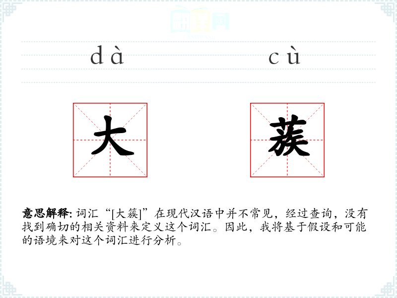 词汇“[大簇]”在现代汉语中并不常见,经过查询,没有找到确切的相关资料来定义这个词汇。因此,我将基于假设和可能的语境来对这个词汇进行分析。