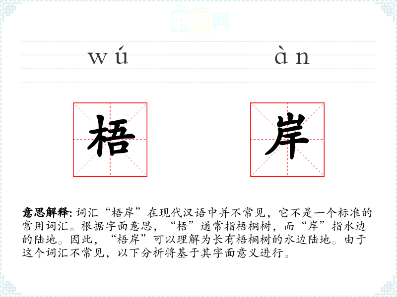 词汇“梧岸”在现代汉语中并不常见,它不是一个标准的常用词汇。根据字面意思,“梧”通常指梧桐树,而“岸”指水边的陆地。因此,“梧岸”可以理解为长有梧桐树的水边陆地。由于这个词汇不常见,以下分析将基于其字面意义进行。