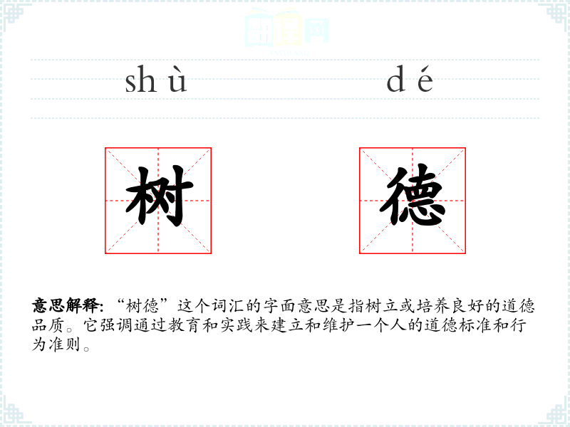 “树德”这个词汇的字面意思是指树立或培养良好的道德品质。它强调通过教育和实践来建立和维护一个人的道德标准和行为准则。