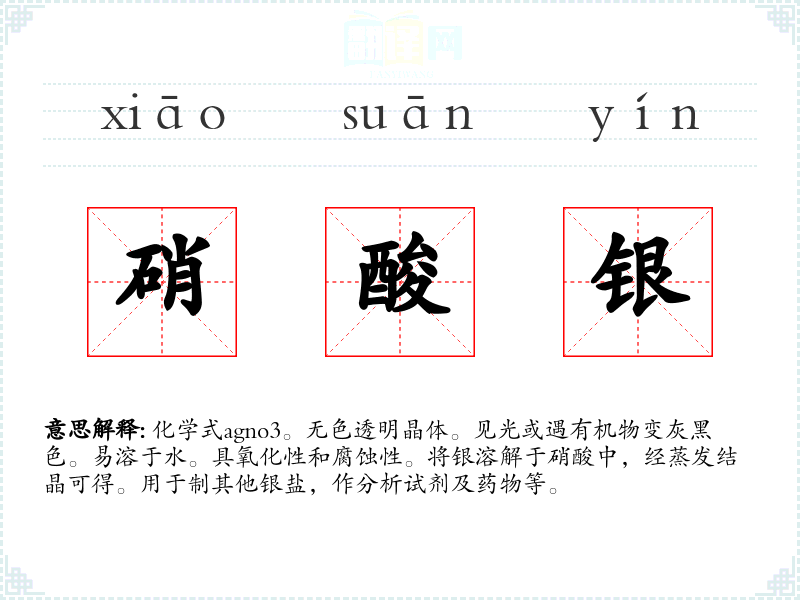 化学式agno3。无色透明晶体。见光或遇有机物变灰黑色。易溶于水。具氧化性和腐蚀性。将银溶解于硝酸中,经蒸发结晶可得。用于制其他银盐,作分析试剂及药物等。