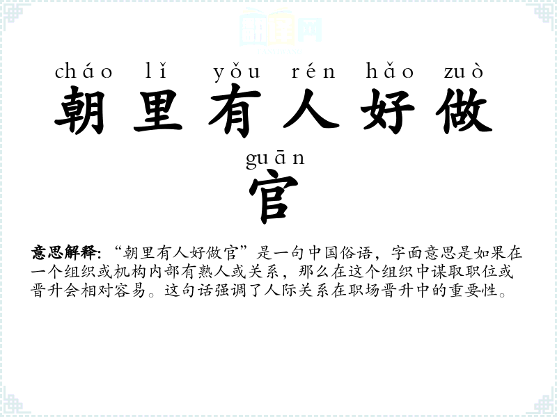“朝里有人好做官”是一句**俗语,字面意思是如果在一个组织或机构内部有熟人或关系,那么在这个组织中谋取职位或晋升会相对容易。这句话强调了人际关系在职场晋升中的重要性。