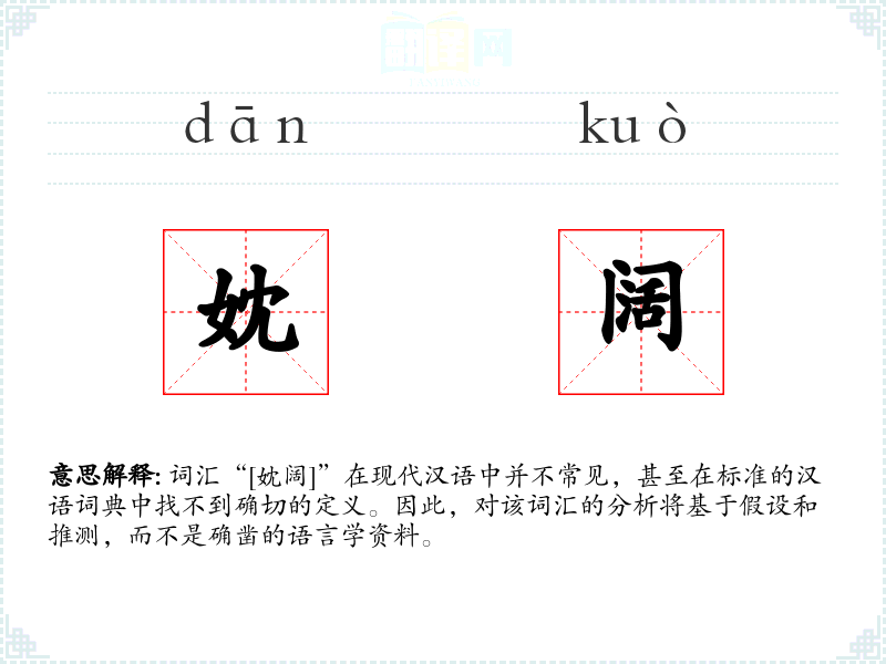词汇“[妉阔]”在现代汉语中并不常见,甚至在标准的汉语词典中找不到确切的定义。因此,对该词汇的分析将基于假设和推测,而不是确凿的语言学资料。