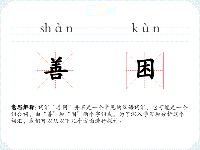 词汇“善困”并不是一个常见的汉语词汇,它可能是一个组合词,由“善”和“困”两个字组成。为了深入学*和分析这个词汇,我们可以从以下几个方面进行探讨: