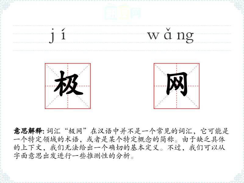 词汇“极网”在汉语中并不是一个常见的词汇,它可能是一个特定领域的术语,或者是某个特定概念的简称。由于缺乏具体的上下文,我们无法给出一个确切的基本定义。不过,我们可以从字面意思出发进行一些推测性的分析。