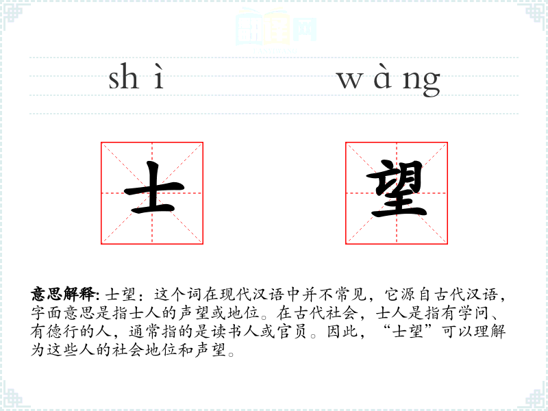 士望:这个词在现代汉语中并不常见,它源自古代汉语,字面意思是指士人的声望或地位。在古代社会,士人是指有学问、有德行的人,通常指的是读书人或官员。因此,“士望”可以理解为这些人的社会地位和声望。