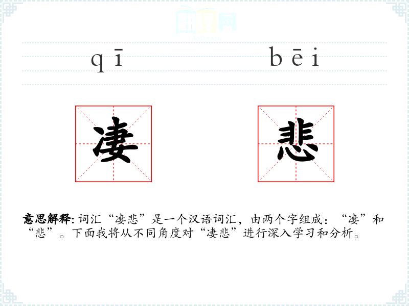 词汇“凄悲”是一个汉语词汇,由两个字组成:“凄”和“悲”。下面我将从不同角度对“凄悲”进行深入学*和分析。