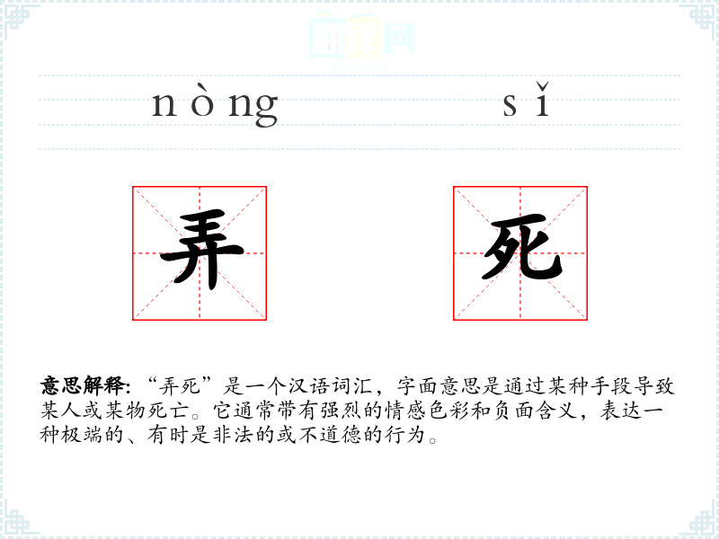 “弄死”是一个汉语词汇,字面意思是通过某种手段导致某人或某物死亡。它通常带有强烈的情感色彩和负面含义,表达一种极端的、有时是非法的或不道德的行为。