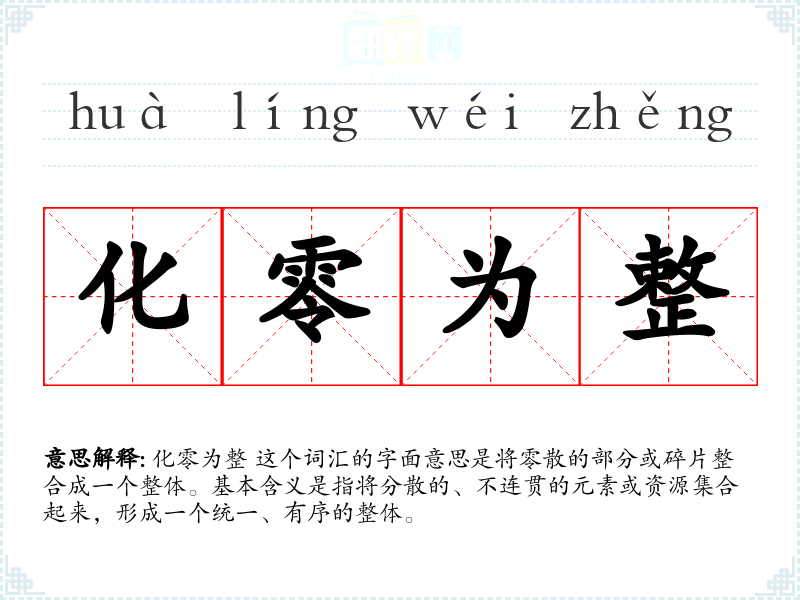 化零为整 这个词汇的字面意思是将零散的部分或碎片整合成一个整体。基本含义是指将分散的、不连贯的元素或资源集合起来,形成一个统一、有序的整体。