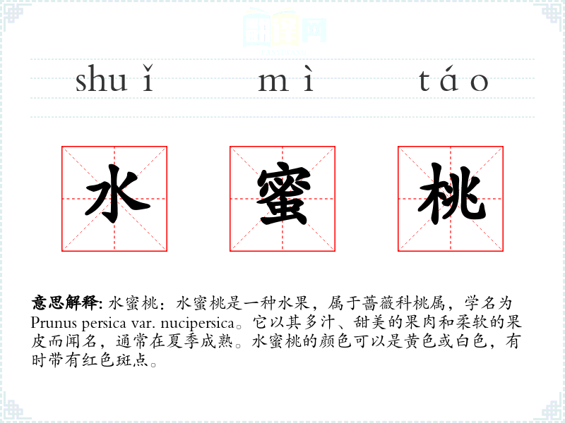 "水蜜桃"的意思解释、水蜜桃是什么意思由翻译网汉语词典查词提供。