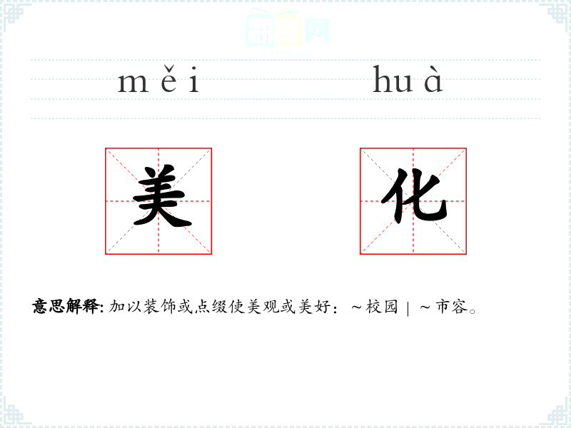 加以装饰或点缀使美观或美好:~校园|~市容。