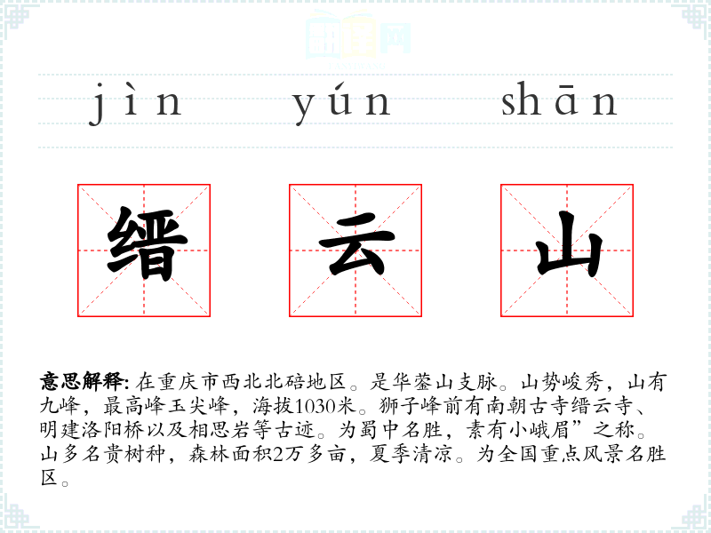1.在重庆市西北北碚地区。是华蓥山支脉。山势峻秀,山有九峰,最高峰玉尖峰,海拔1030米。狮子峰前有南朝古寺缙云寺、明建洛阳桥以及相思岩等古迹。为蜀中名胜,素有小峨眉”之称。山多名贵树种,森林面积2万多亩,夏季清凉。为全国重点风景名胜区。