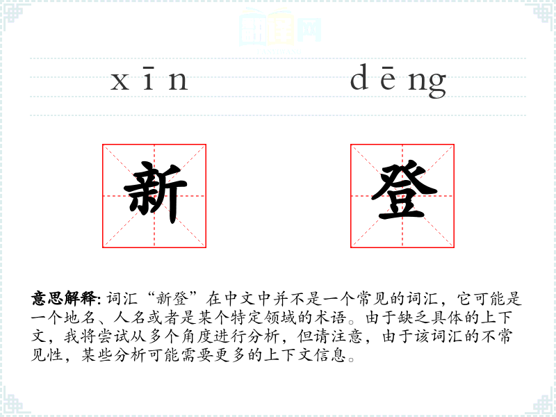 词汇“新登”在中文中并不是一个常见的词汇,它可能是一个地名、人名或者是某个特定领域的术语。由于缺乏具体的上下文,我将尝试从多个角度进行分析,但请注意,由于该词汇的不常见性,某些分析可能需要更多的上下文信息。