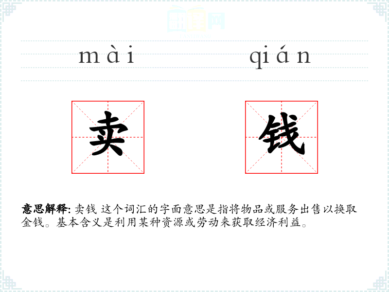 卖钱 这个词汇的字面意思是指将物品或服务出售以换取金钱。基本含义是利用某种资源或劳动来获取经济利益。